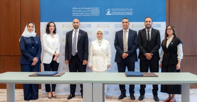 وقع الاتفاقية من جانب مؤسسة خالد بن سلطان القاسمي، سعادة عبدالله الحريمل عضو مجلس أمناء المؤسسة، ومن جانب مؤسسة أمان لحماية الطفولة، عبد الله سوسي رئيس المؤسسة، بحضور عدد من كبار المسؤولين من وزارة التضامن والإدماج الاجتماعي والأسرة، ومؤسسة التعاون الوطني في المملكة المغربية.