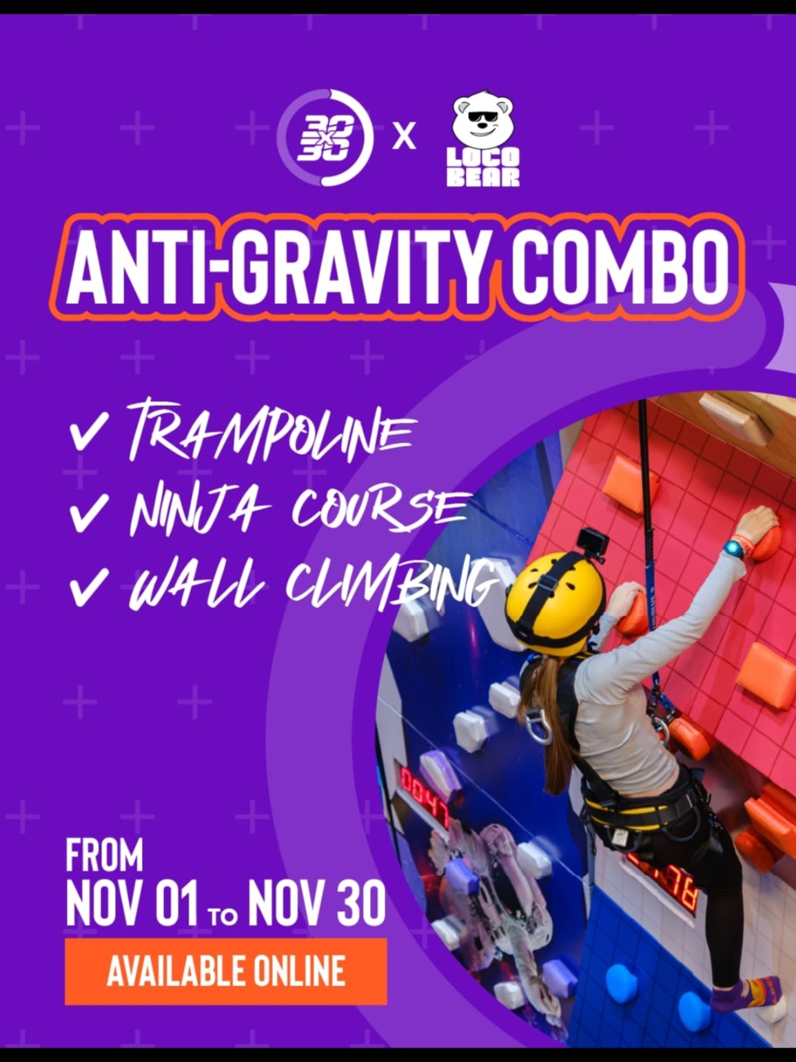 يجمع عرض “الكومبو المقاوم للجاذبية” بين اللياقة البدنية والترفيه ضمن باقة واحدة مليئة بالطاقة والحيوية. فهو مزيج قوي بين النشاط والمرح، يمنحكم تجربة فريدة من نوعها تختبر القوة والمرونة والقدرة على التحمّل. وُيعد مثالياً للأطفال واليافعين والبالغين على حدّ سواء، حيث يعتبر وسيلة ممتعة ونشطة لرفع معدل ضربات القلب، وقضاء وقت ممتع ومفيد مع العائلة أو الأصدقاء.
