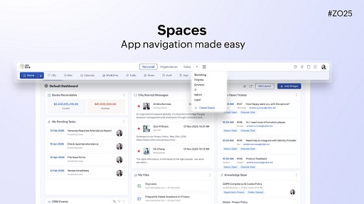 قدّمت زوهو في «زوهو ون» واجهة تجربة مستخدم جديدة تجمع التطبيقات ضمن مساحات قابلة للتخصيص. وتضمّ المساحة الشخصية أدوات الإنتاجية الفردية، فيما توفر المساحة التنظيمية أدوات التواصل على مستوى الشركة. أما مساحات الأقسام مثل الموارد البشرية والتسويق والمالية، فتمكّن كل قسم من الوصول إلى الأدوات المرتبطة بمهامه التشغيلية.