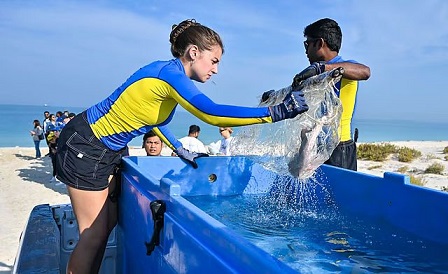 الإمارات تطلق أسماك مهددة بالانقراض في بحر العرب لدعم البيئة البحرية الأنواع المهددة بالانقراض التي تم إطلاقها في محمية جبل علي للحياة البرية تراوحت أعمارها بين 8 إلى 10 أشهر